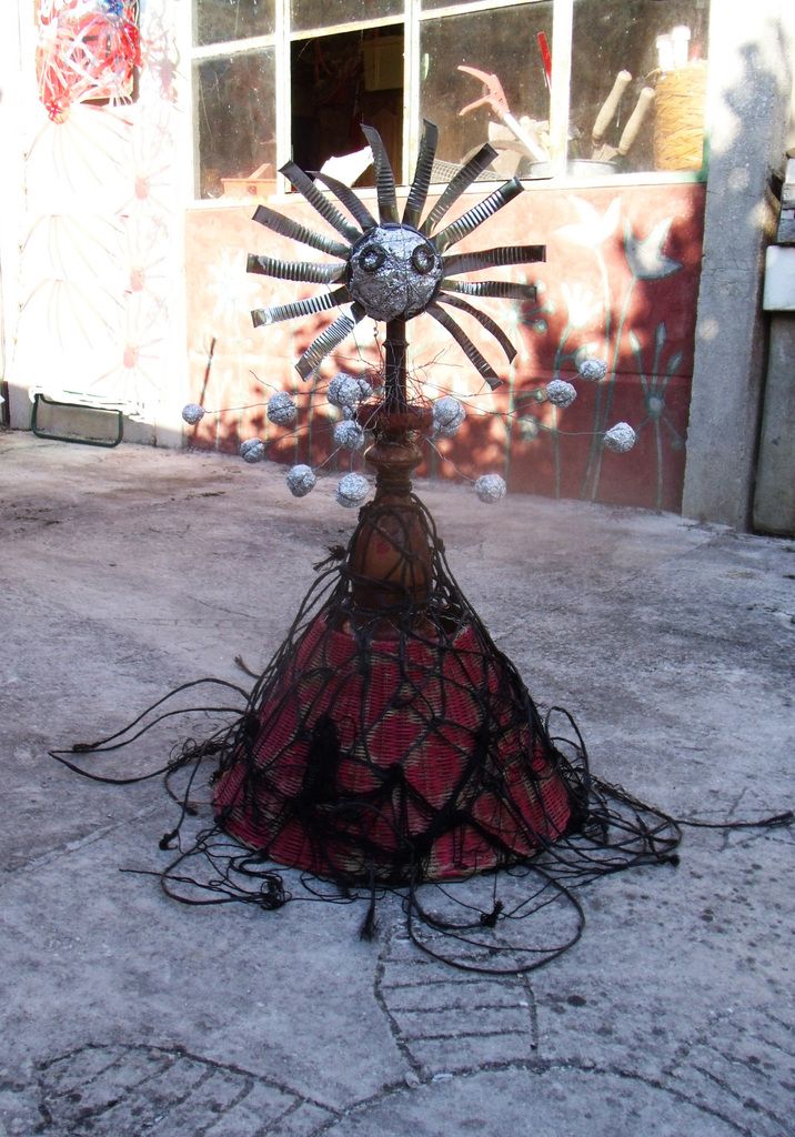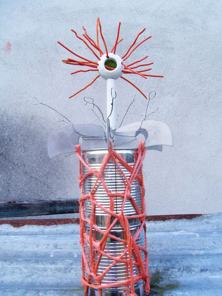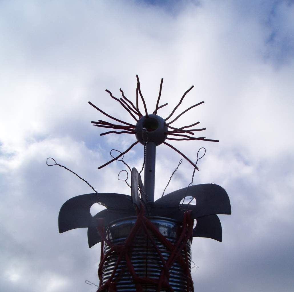 Toujours dans l'idée de travailler à partir de matériaux de récupération, voici une tête de dragon, en pots de fleurs et fûts de bière principalement.